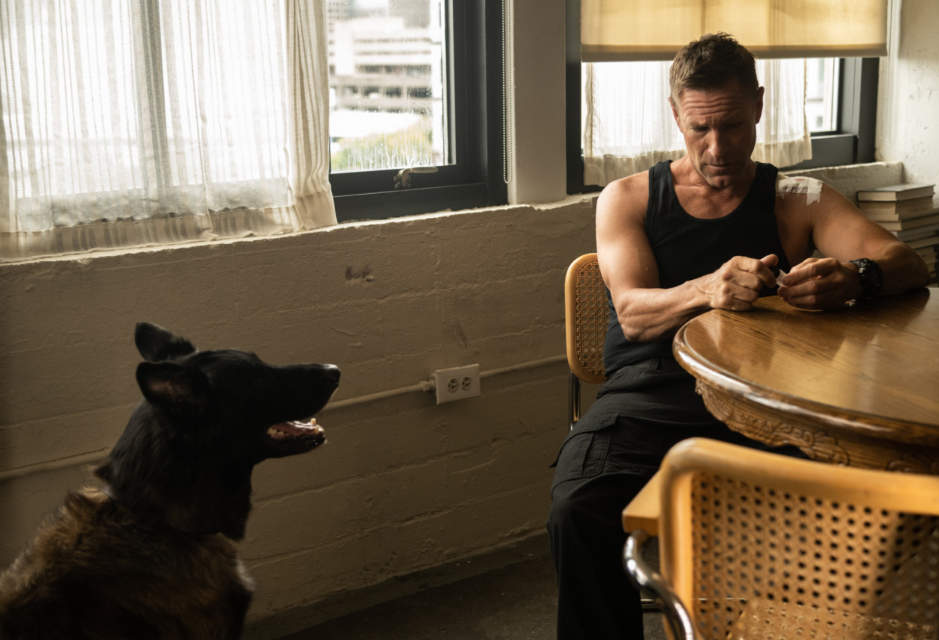 에크하트는 말수 적고 음울한 제이크를 설득력 있게 연기한다. 특히 경찰견과 함께하는 장면에서 그의 연기는 빛을 발한다. 개와 나누는 혼잣말, 삭스를 처음 데려오는 장면, 그리고 마지막 대결에서의 긴장감까지 — 대사보다 눈빛과 몸짓으로 감정을 전달하는 그의 방식은 이 영화가 B급 액션에 머무르지 않게 하는 결정적 요소다.